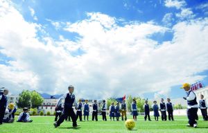 拉萨的孩子们在蓝天白云下玩耍资料图